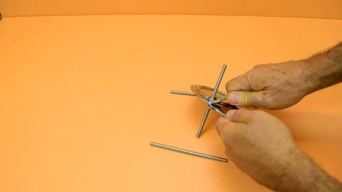 Обеспечиваем одинаковую длину стержней по сторонам обечайки и фиксируем их в таком положении двумя гайками, накручиваемыми на стержни с двух концов. Затем с помощью пары стальных трубок, надетых на концы стержней, изгибаем их на одинаковый угол.