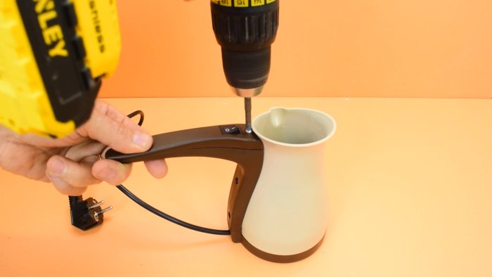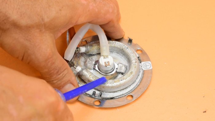 Демонтируем с помощью доступных инструментов ручку и донце, которые обычно крепятся к корпусу винтами. Далее удаляем электропроводку, соединительные клеммы и откручиваем нагревательный элемент.