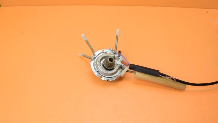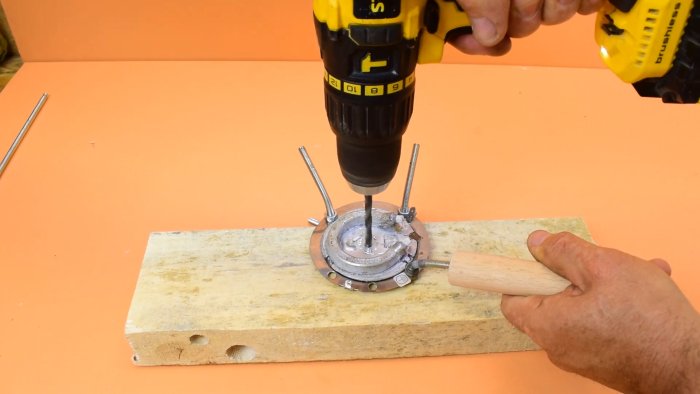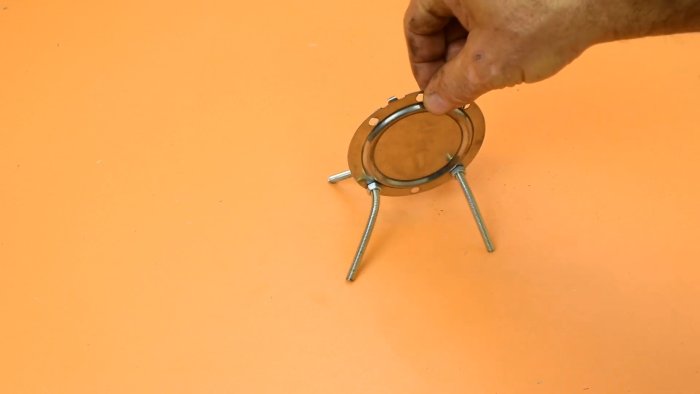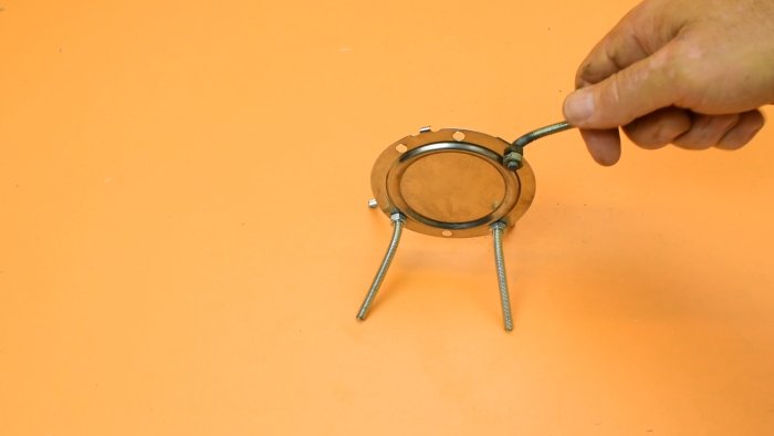 В центре круга с нагревательным элементом сверлим отверстие для закрепления с помощью винта двух латунных втулок с большим и малым отверстием. Для устойчивости аппарата на концы ножек самоделки надеваем укороченные пластиковые дюбели.