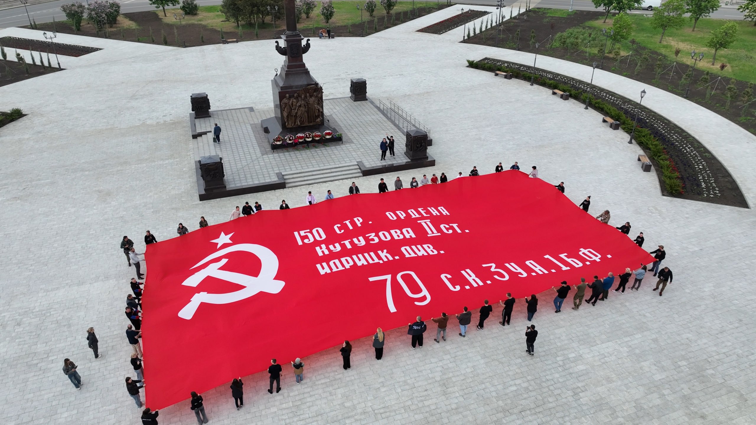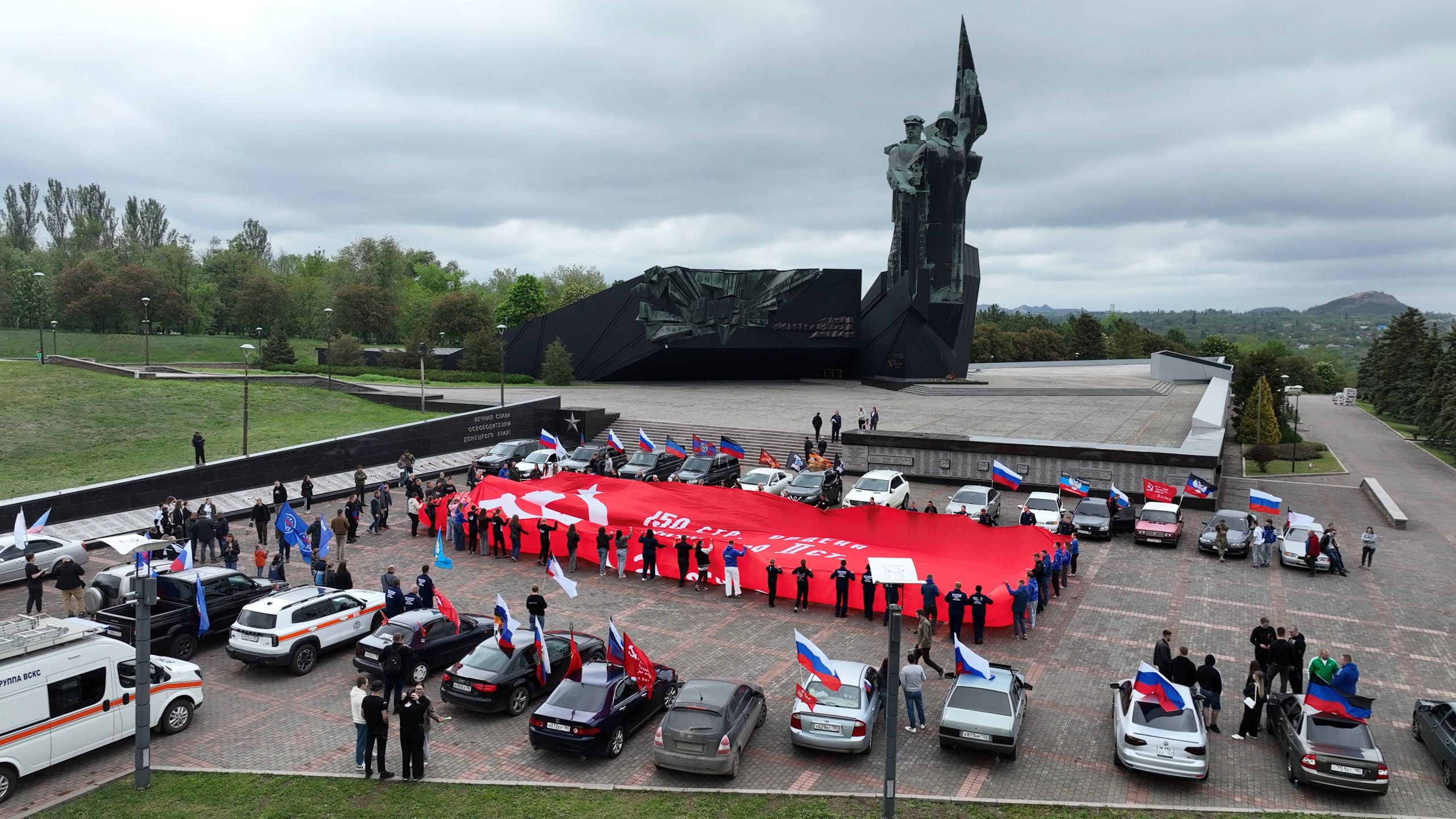 В Донецке и Мариуполе молодежь развернула Знамя Победы — 450 м² в честь подвига предков. Более 100 машин автопробега соединили два города