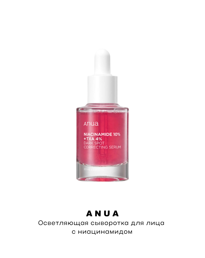 Мой главный корейский любимчик – это сыворотка с ниацинамидом бренда Anua. У средства жирненькая текстура, поэтому я наношу его на ночь, как завершающий этап в уходе. Утром кожа очень увлажненная и просто светится изнутри, а при постоянном использовании постакне заметно тускнеет! Еще в сыворотке есть витамин С, поэтому при использовании не стоит забывать про SPF-крем (к слову, про него вообще никогда не стоит забывать).
