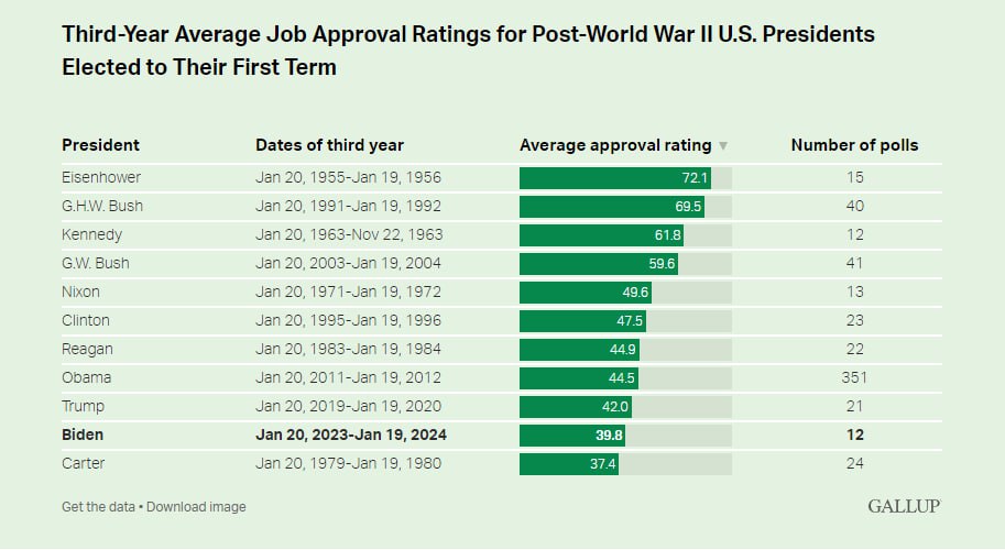 Gallup: к третьему году пребывания президента Джо Байдена на посту президента США, с 20 января 2023 года по 19 января 2024 года, в среднем 39,8% американцев одобряли его работу.