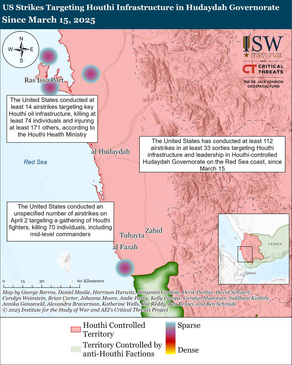 Значительная часть авиаударов США была нанесена по провинции Ходейда, вероятно, с целью ослабить возможности хуситов по нанесению ударов и разрушить другую инфраструктуру хуситов.