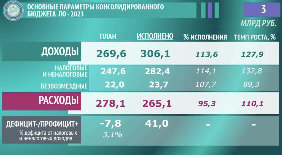 С докладом перед парламентариями выступил первый зампред правительства Ленобласти Роман Марков: доходы Ленобласти по итогам 2023 года составили 306,1 млрд рублей, а расходы — 265 млрд рублей, профицит – 41 млрд рублей.