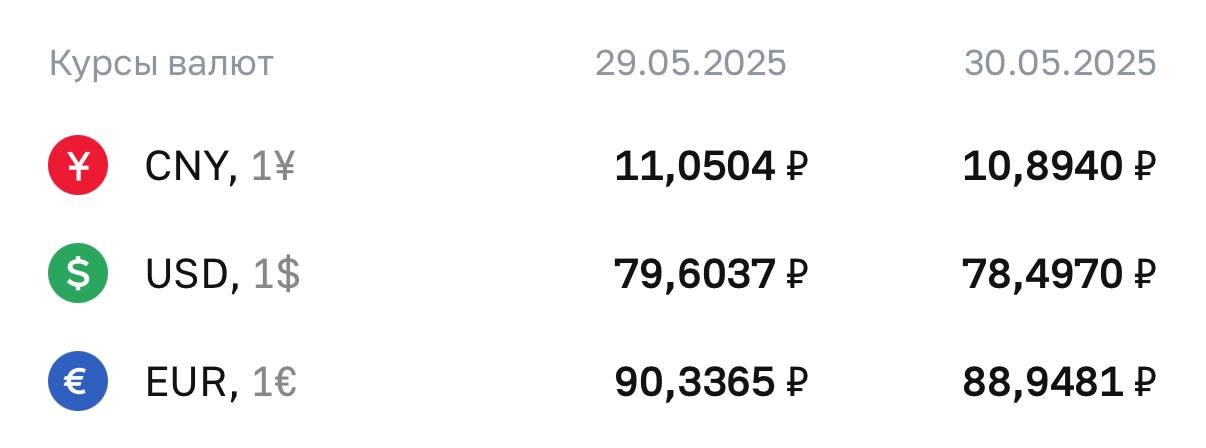 ЦБ РФ понизил курс доллара на 30 мая до 78,5 рубля, евро — до 88,95 рубля, юаня — до 10,89 рубля.