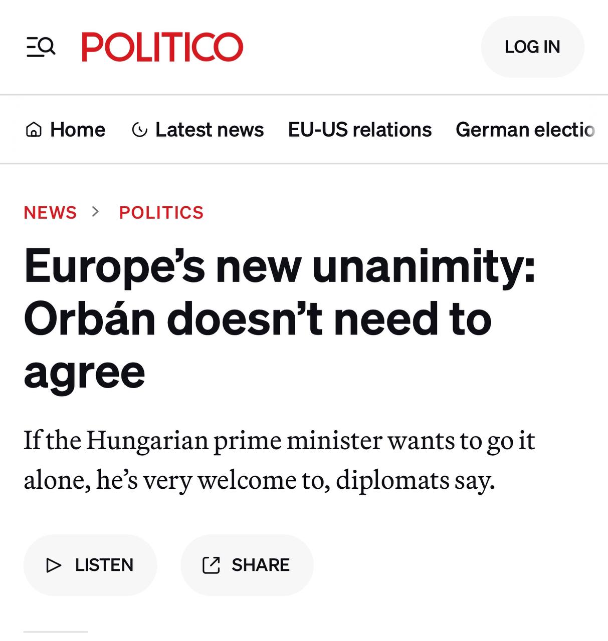 «Орбану <…> дали много шансов, но он отверг протянутую руку. Безопасность Европы — слишком серьезный вопрос, чтобы вступать в переговоры с одним человеком, который видит вещи на 180 градусов иначе, чем все остальные», — отметил один из источников.