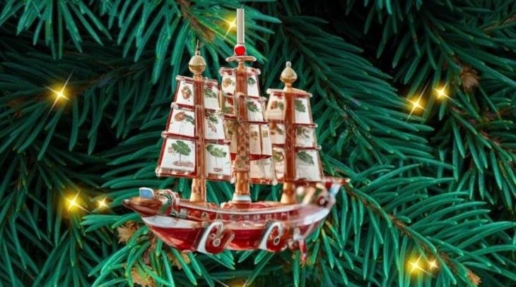 Корабль-музей Гото Предестинация превратился в кораблик из красного дерева с тремя мачтами и украшенными растениями парусами.