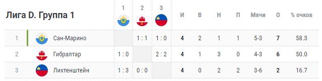 Сборная Сан-Марино получила повышение в классе. Две победы в четырёх матчах, семь очков, первое место. Как вам такое? Команда опередила Гибралтар всего лишь на одно очко. Вторую команду группы теперь ждут стыки за право сыграть в Лиге С.