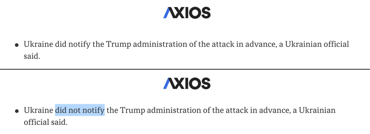Axios исправил текст статьи, в которой утверждалось, что Украина якобы предупредила Трампа о сегодняшней атаке на Россию.