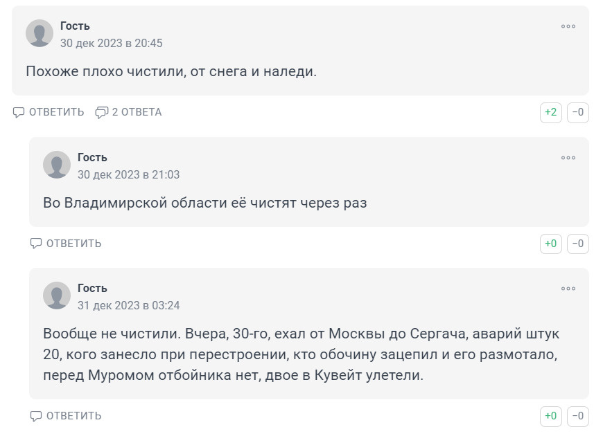 — Вообще не чистили. 30 декабря, ехал от Москвы до Сергача, аварий штук 20, кого занесло при перестроении, кто обочину зацепил и его размотало, перед Муромом отбойника нет, двое в Кувейт улетели.