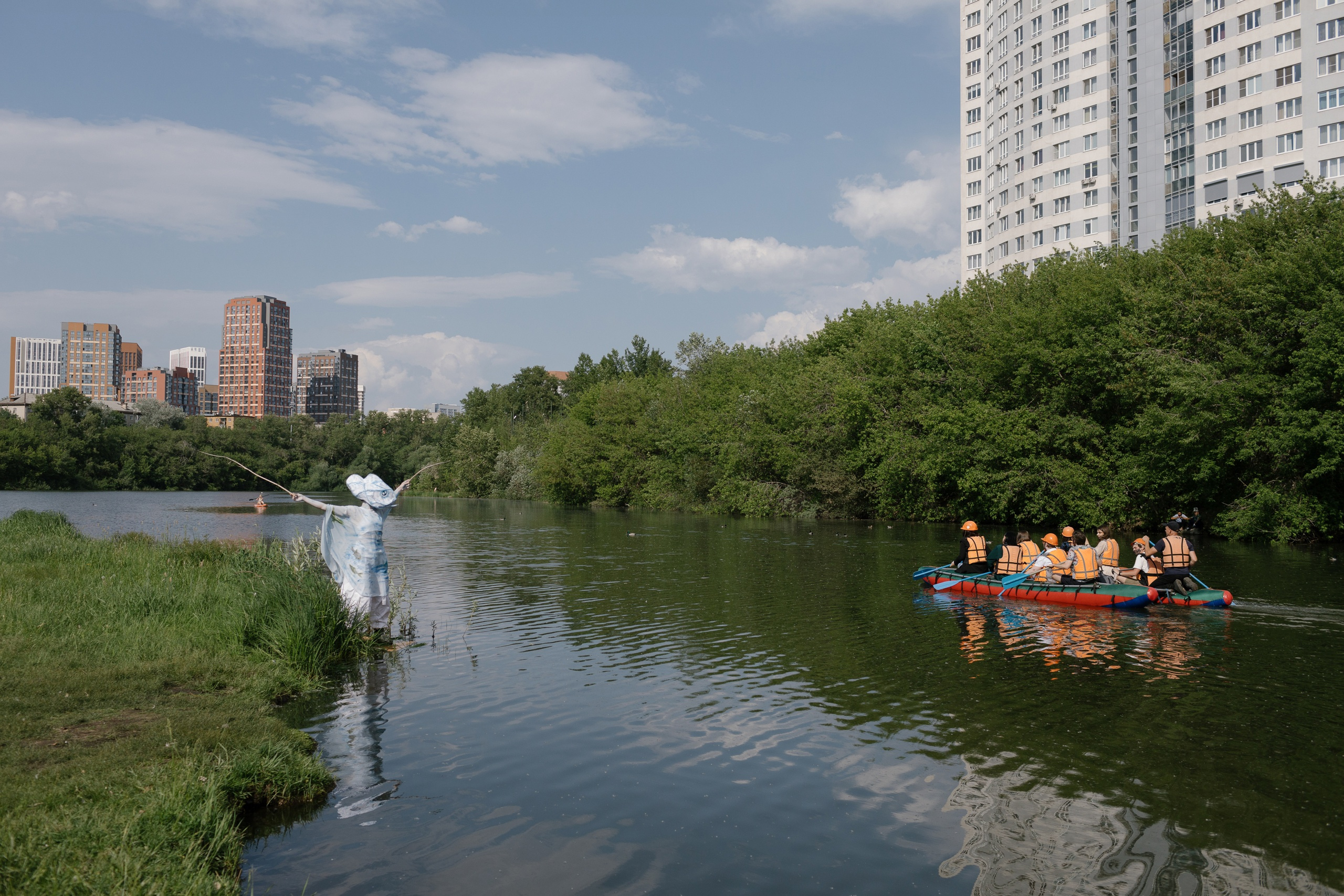 — Вы пойдете на катамаранах, вам выдадут весла и всем нужно будет грести, но за это вы увидите перфомансы на берегах нашей реки. Идея была в том, что река — это некая константа, которая постоянно изменяется на протяжении многих столетий. Вы сможете увидеть персонажей из другого времени и другого мифологического пространства, — рассказала Татьяна Панаиотиди, куратор и режиссер проекта