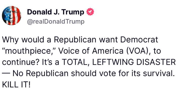 Трамп назвал «Голос Америки»* «катастрофическим проектом» левых и призвал республиканцев в конгрессе не голосовать за его сохранение: «Уничтожьте его!»