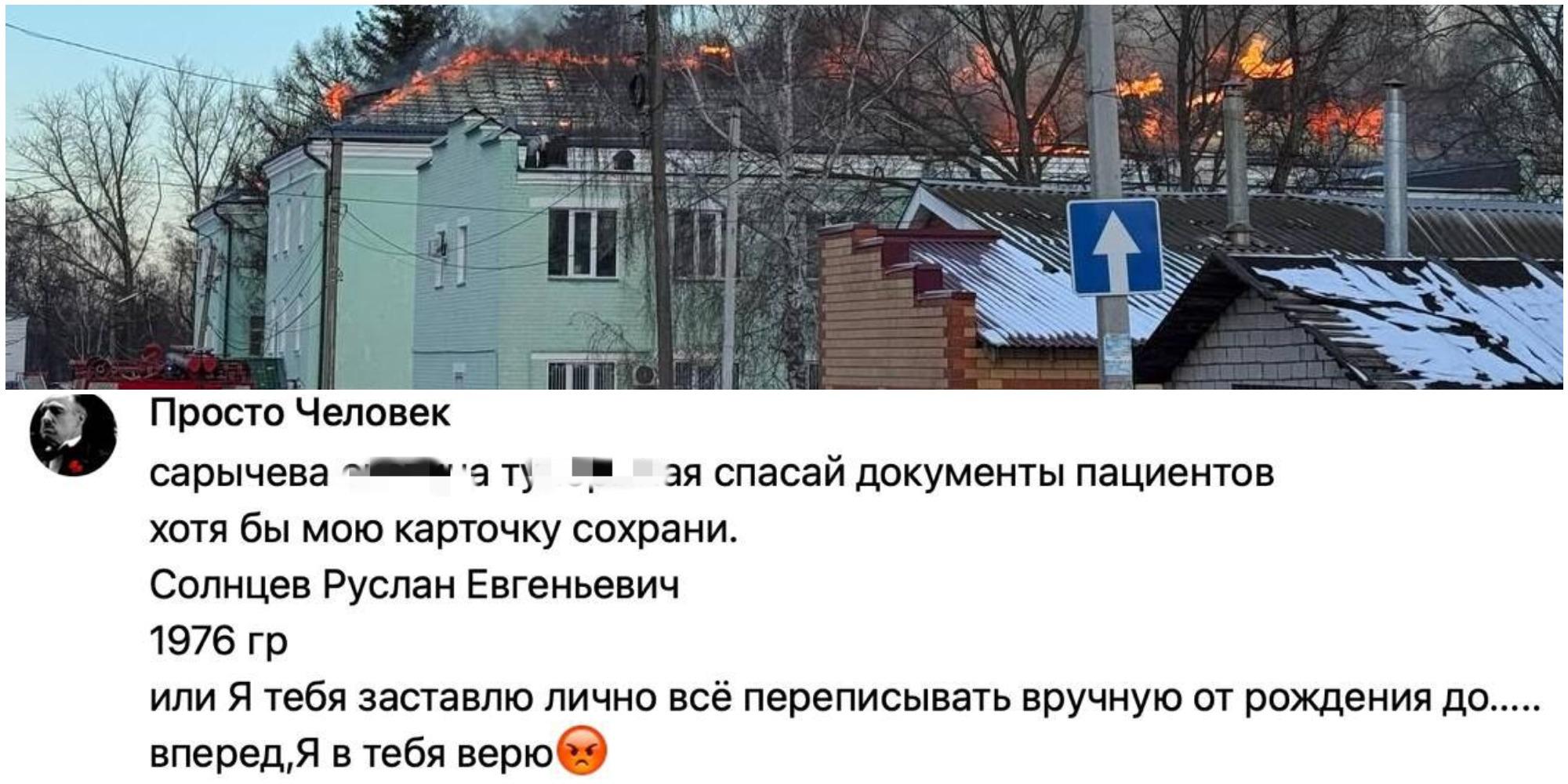 Житель Рыбного Руслан Солнцев потребовал от сотрудницы больницы РЖД спасти свою медицинскую карточку из пожара. Соответствующий комментарий он разместил в соцсети.