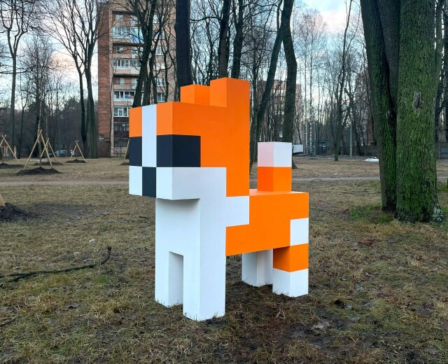 Ранее, осенью, в сквере на пересечении проспектов Энгельса и Пархоменко тоже появился пиксельный кот. Тогда, как пояснил художник, он встречал золотую осень.