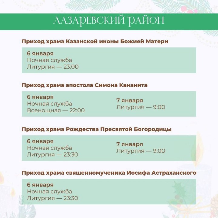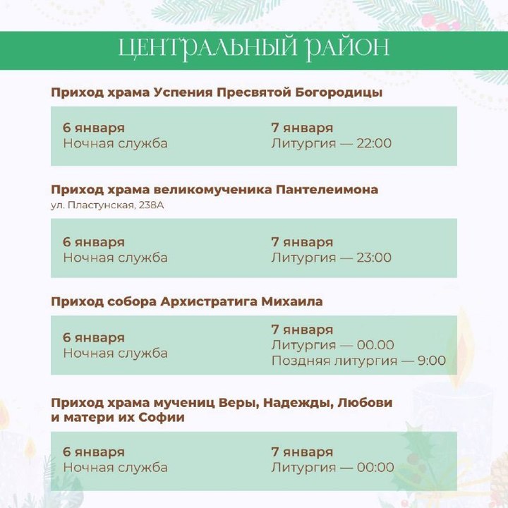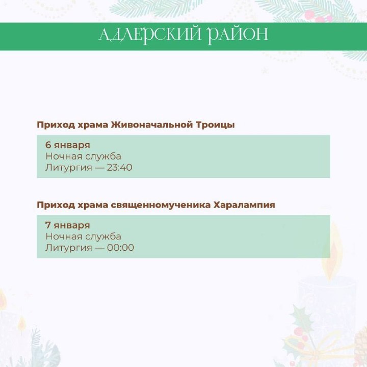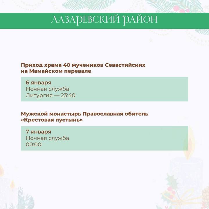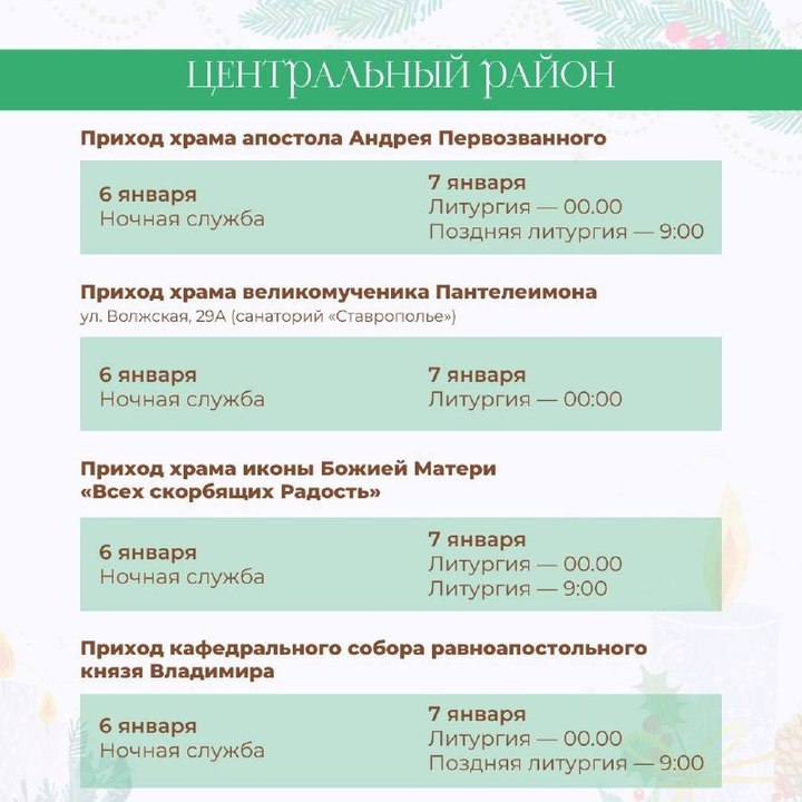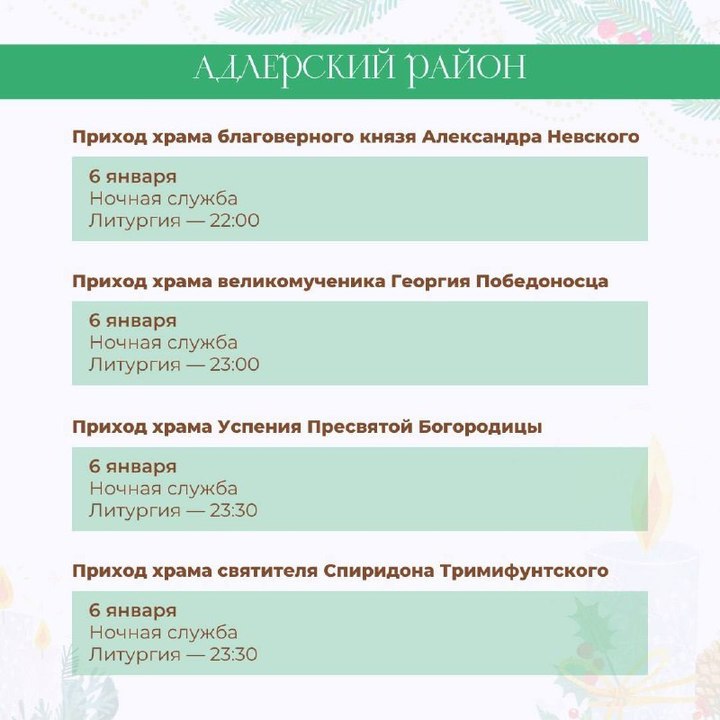 По данным пресс-службы МЦУ Сочи, за каждым храмом закреплено ответственное лицо. Так, в Центральном округе 6 января состоится ночная служба в соборе Архистратига Михаила, храме великомученика Пантелеймона, кафедральном соборе равноапостольного князя Владимира и других. В полночь пройдет литургия, а в 9 часов утра — поздняя литургия. В каких еще храмах состоятся рождественские богослужения, можно на карточках, подготовленных МЦУ курорта.