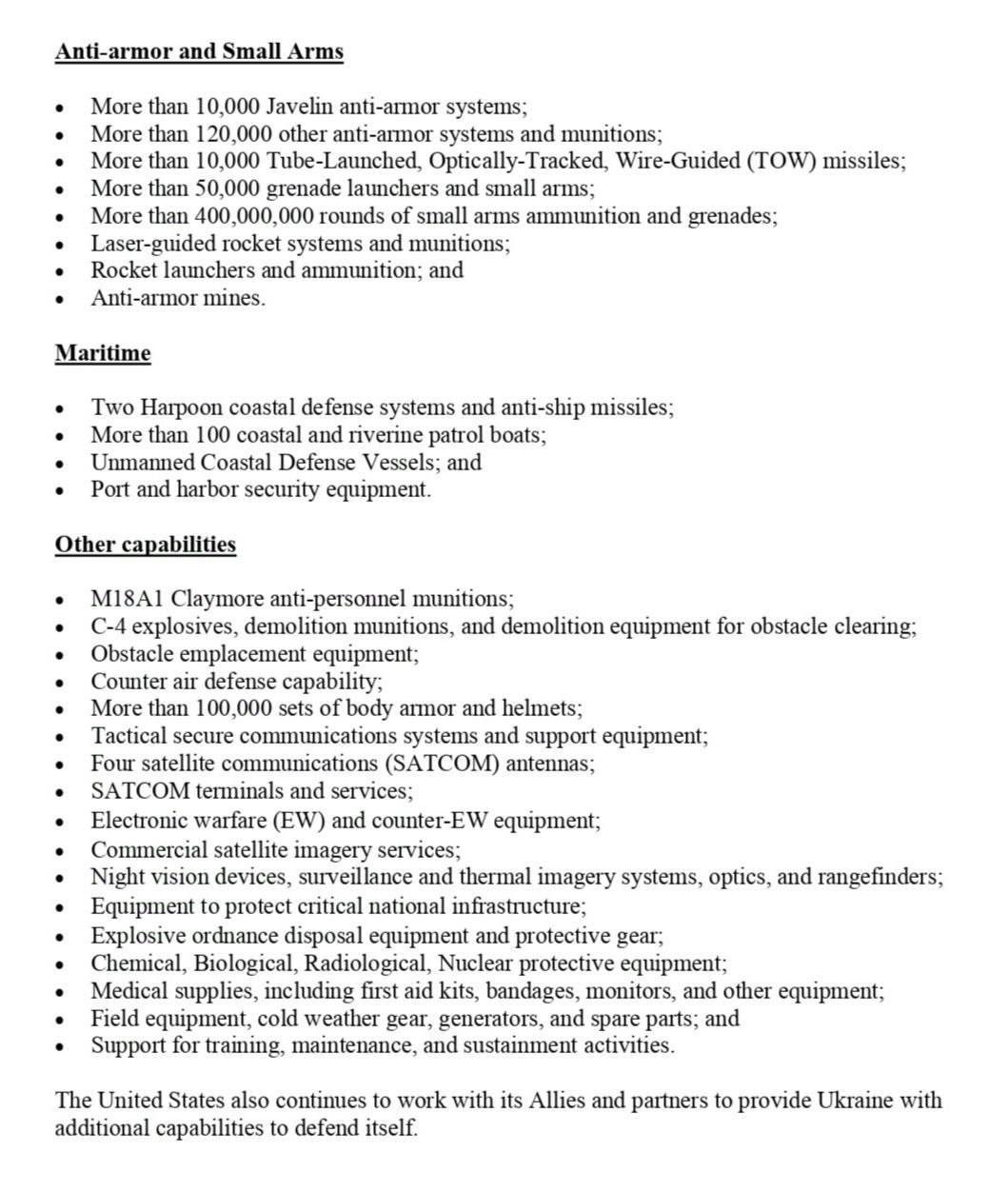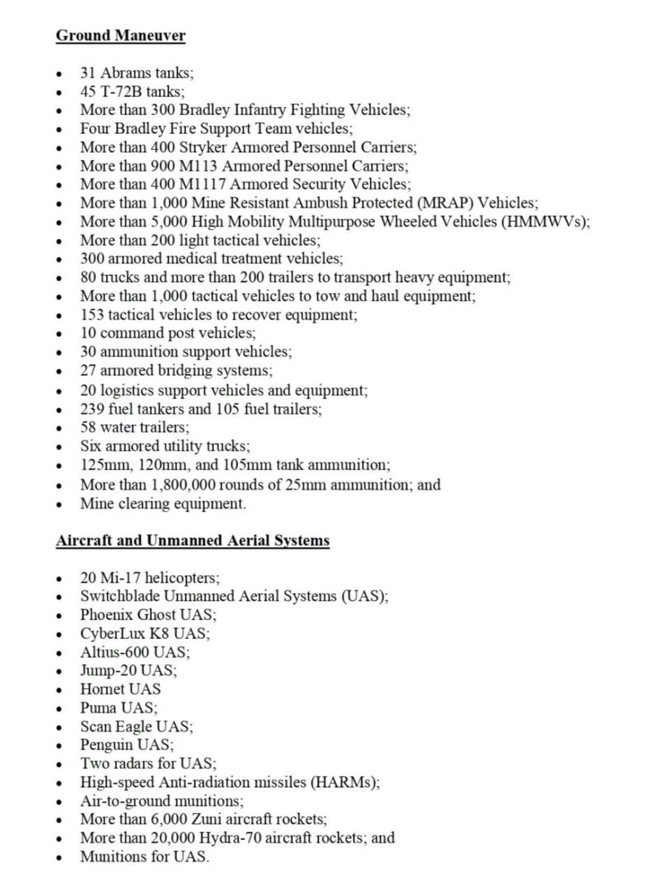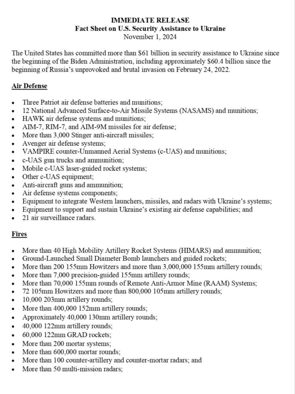 Соединенные Штаты представили полный список вооружений, переданных Украине с 24 февраля 2022 года по 1 ноября 2024 года.