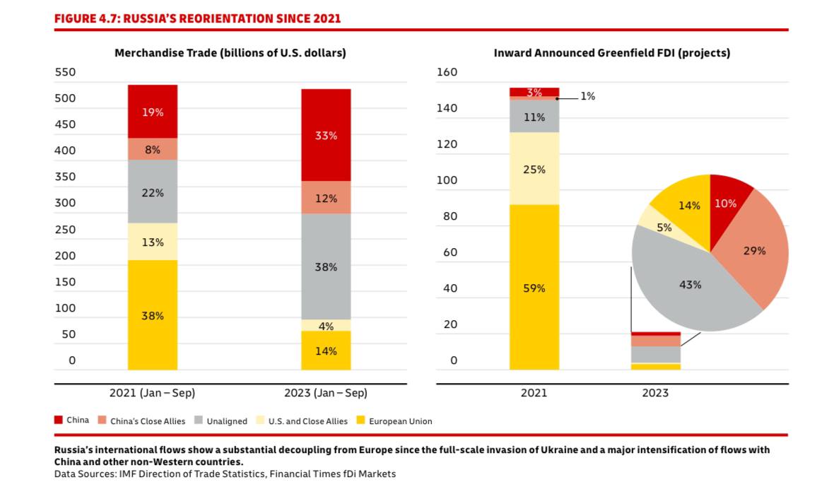 DHL: Внешнеэкономические связи РФ с остальным миром претерпели с 24.02 колоссальные изменения, особенно в сфере иностранных инвестиций в проекты внутри РФ. Сегодня ключевыми инвесторами проектов (общий объем иностранных инвестиций сократился кардинально) в РФ выступают Беларусь, Индия и ОАЭ. Доля внешней торговли с Китаем выросла до 45% (с 27% до войны). Тогда как доля торговли с Западом упала - с 51% до 18%. Вместе с тем, торговля РФ-Запад продолжается, теперь только в основном через третьи страны.