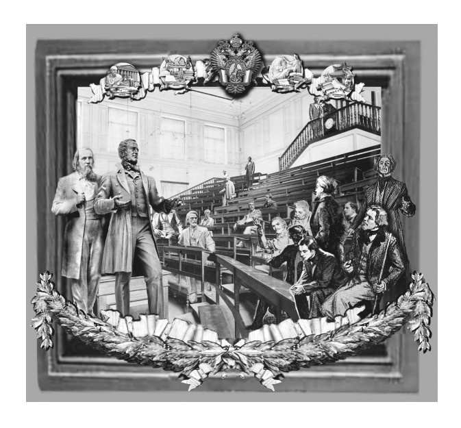 Докладчик перешел к рассказу о барельефах. Один — коллаж с видом на университет, с Александром I и Уваровым. Причем обе скульптуры, признался Щербаков, его же собственного авторства — император стоит в Александровском саду недалеко от Кремля, а Уваров — это памятник инженеру фон Герстнеру на Витебском вокзале в Петербурге — они с Уваровым похожи, пояснил скульптор. За спиной у них Исаакиевский собор, корабль, адмиралтейство, там же - юбилейные медали. Вариант временный, предупредил автор. Вторая тема — это студенты и преподаватели, там узнаваемая всеми аудитория с часами, герб университета с четырьмя композициями по тематике факультетов.