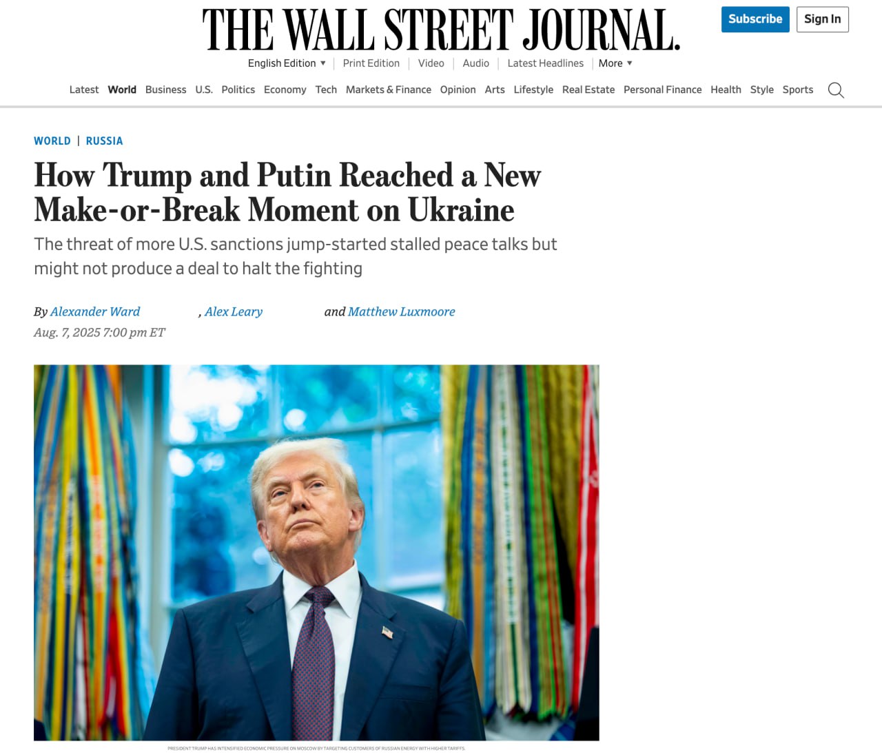 Президент Трамп давно считает, что суть внешней политики — это два лидера в одной комнате, заключающие исторические сделки. Поэтому добиться прекращения огня на Украине вместе с президентом России Владимиром Путиным стало бы тем самым дипломатическим триумфом, о котором он мечтал, пишет The Wall Street Journal.