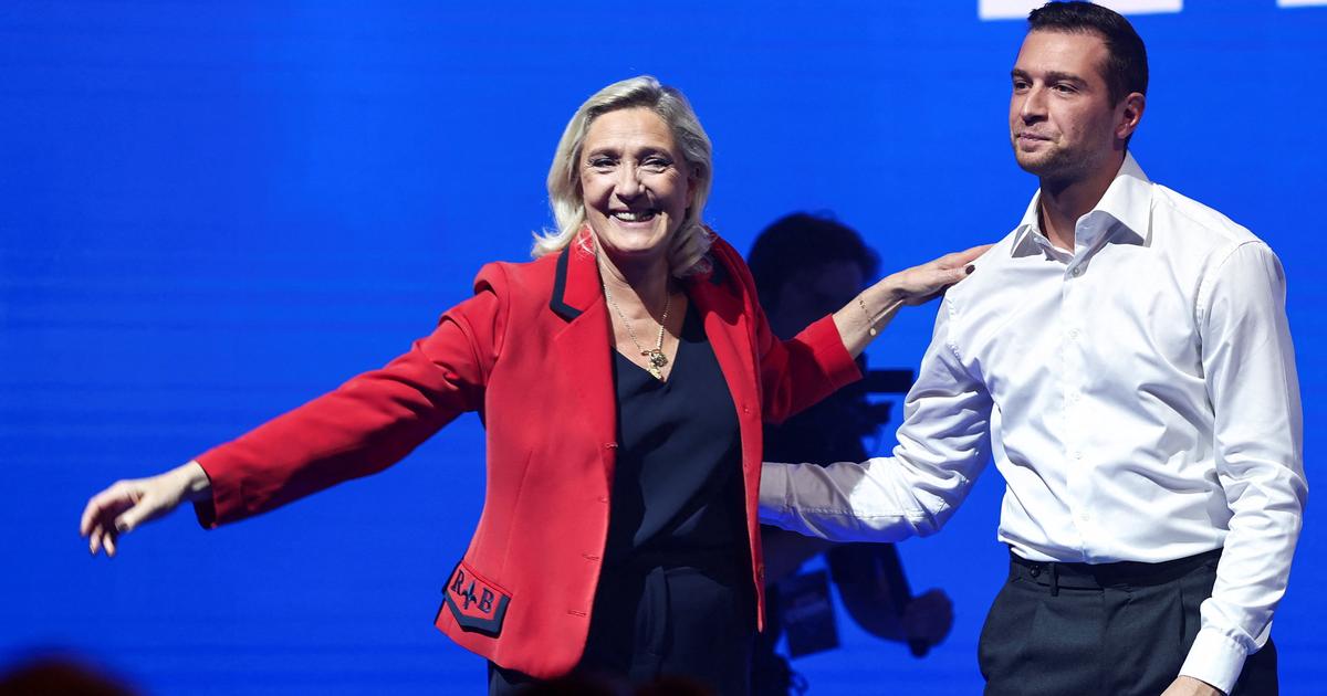 À plus d’un an et demi de l'élection présidentielle, le Rassemblement national est donné largement favori des intentions de vote, entre 34 et 35%, avec un effondrement du bloc central, au coude-à-coude avec la gauche pour une place au second tour, selon un sondage Toluna Harris Interactive pour RTL publié mercredi. Représenté par son président Jordan Bardella ou par la présidente des députés RN Marine Le Pen, le parti à la flamme arrive systématiquement en tête des intentions de vote au premier tour.