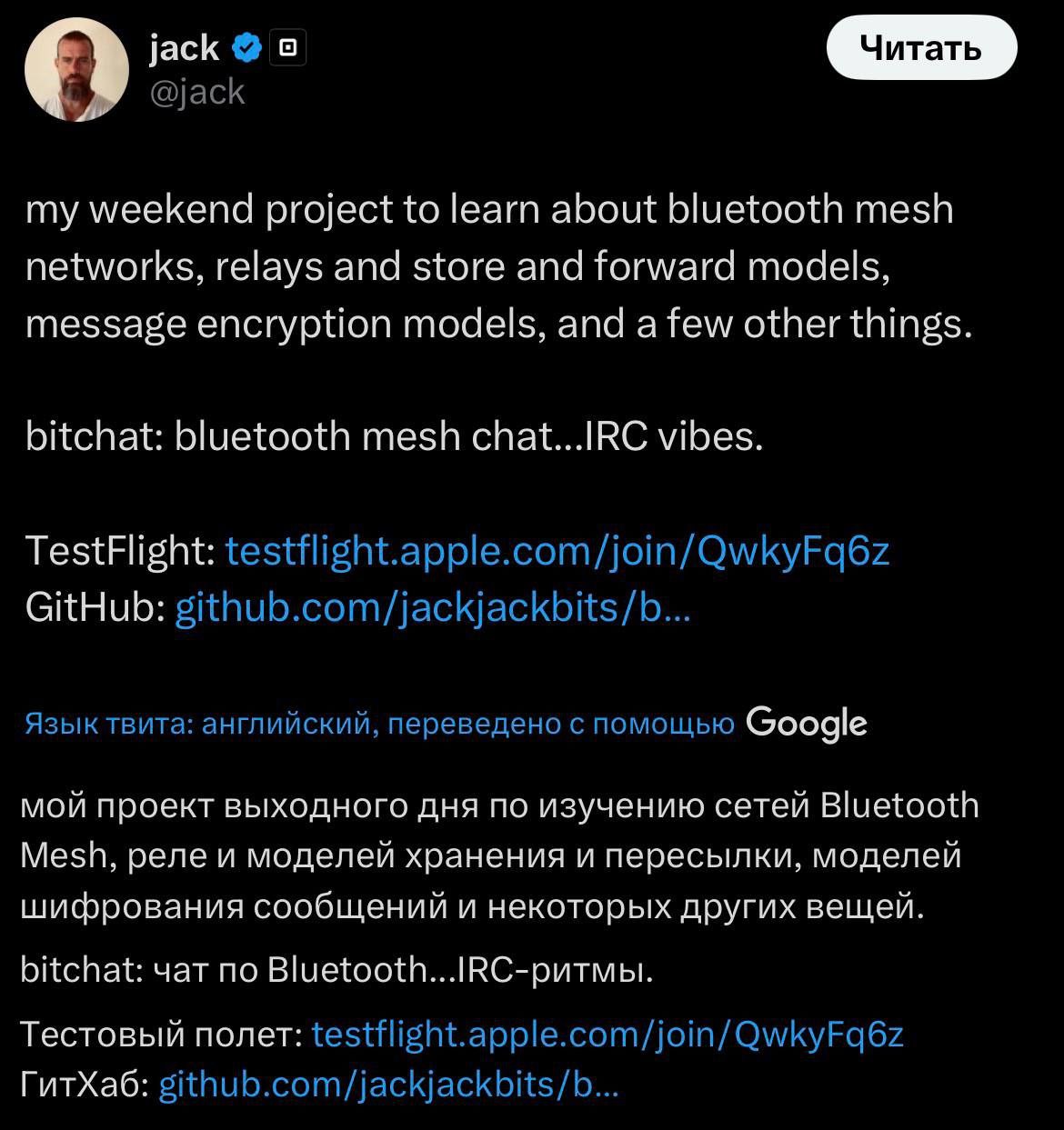Разработка Джека Дорси называется bitchat, и для его работы не потребуется ни интернет, ни мобильная сеть — только ваш смартфон и люди неподалеку. Ожидается, что он будет особенно эффективен во время стихийных бедствий, катастроф и акций протеста.