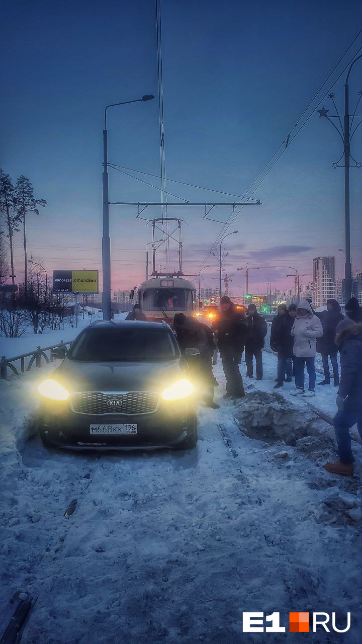 — Машина решила проехать по трамвайным путям, это по Вильгельма де Генина, в промежутке от Вонсовского до кольца на Серафимы Дерябиной. Трамвай в два вагона, битком набитый пассажирами, не проехал из-за него, — рассказал читатель E1.RU.