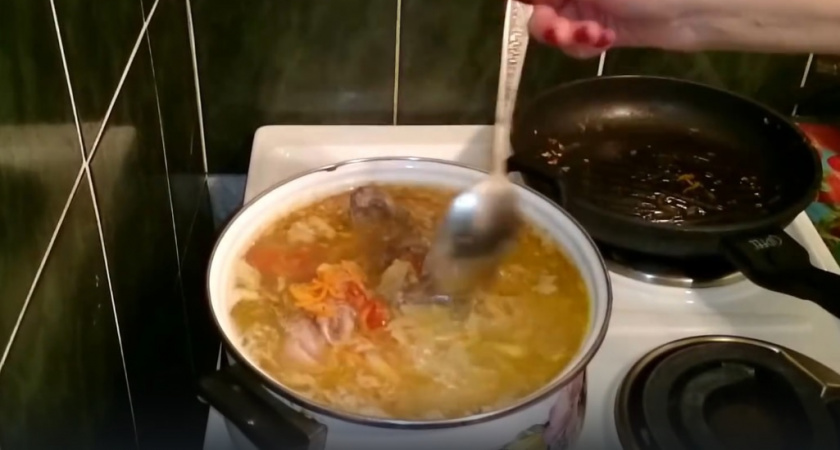 Дальше я могу варить суп на простом говяжьем бульоне, потому что у капусты уже есть копченый аромат и вкус. Поджаренные лук и морковь можно добавить при тушении капусты — а можно уже при варке щей. Еще к капусте мы добавляем душистый и черный перцы, а можно еще добавить гвоздику, лавровый лист.