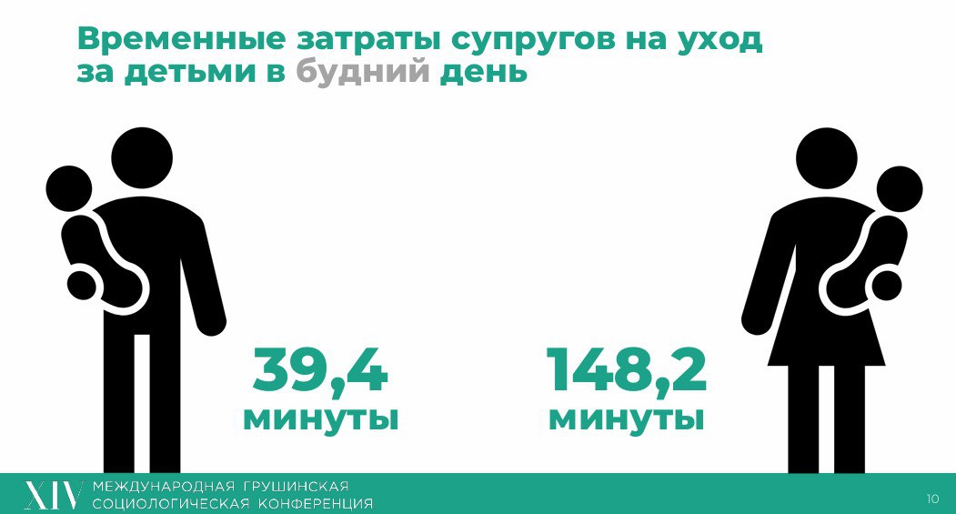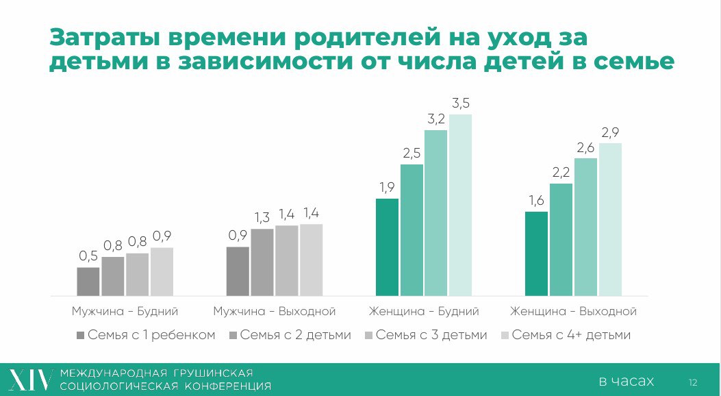 Но вот что интересно, с увеличением детей в семье мужчина перестаёт увеличивать затраты времени на уход за ними (разница в 6 минут в день в семье с 3-мя и 4-мя детьми).