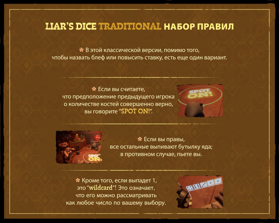 🟠Режим Liar’s Dice - Традиционные правила: Угадайте точное количество кубиков, и смотрите, как все остальные пьют яд, если вы «попали в точку»;