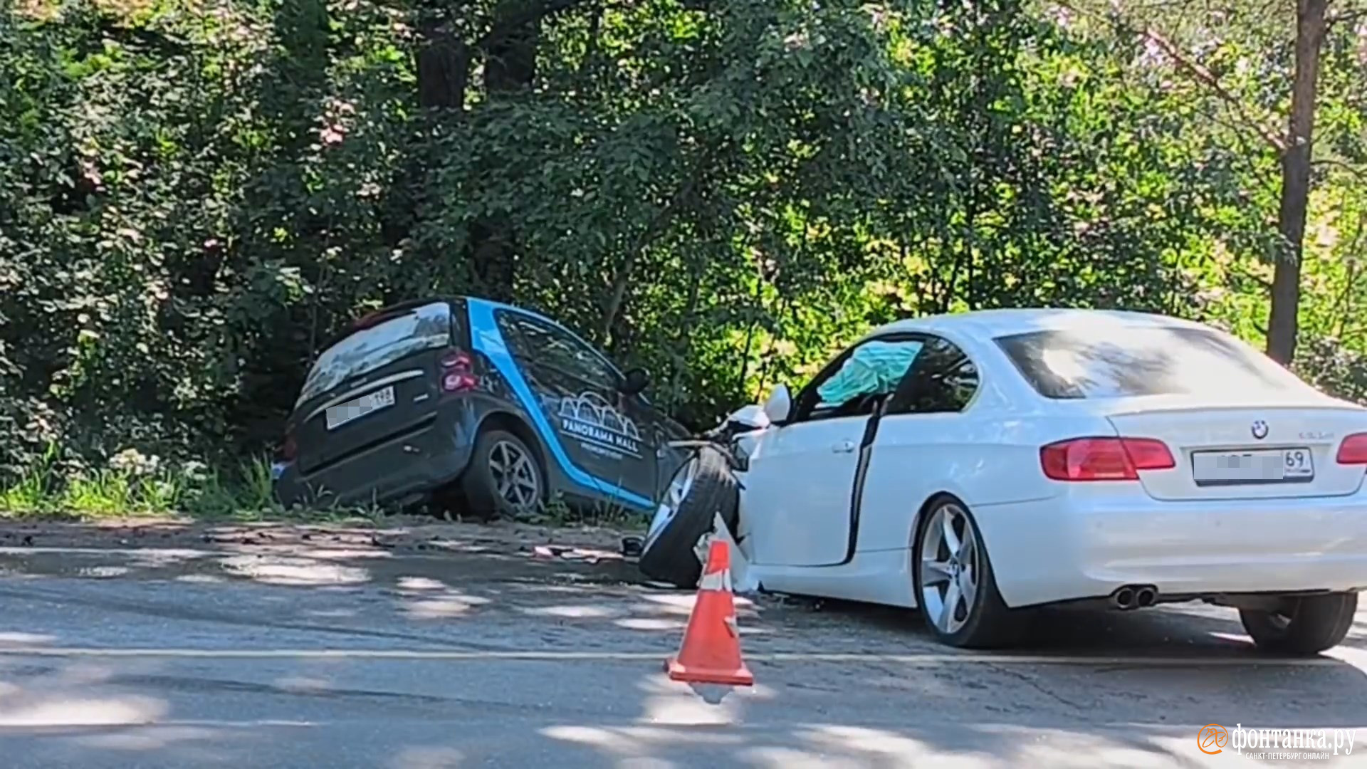 В 12:01 11 июля у дома 1 по Придорожной улице в поселке Кузьмоловский столкнулись автомобили BMW и Smart, сообщили «Фонтанке» в пресс-службе ГУ МВД по Петербургу и Ленобласти. На кадрах с места ДТП, снятых читателем, видно, что «Смарт» выкинуло в кювет, а «БМВ» остался стоять поперек дороги с вывернутым передним колесом.