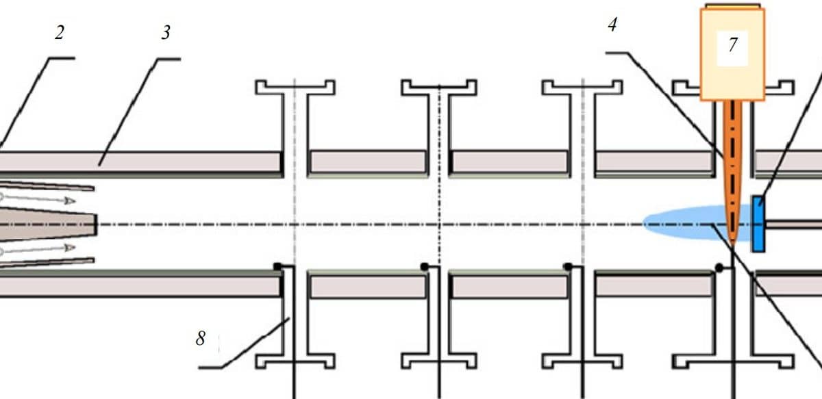 Схема экспериментов на установке МКТ: 1 — импульсный плазменный ускоритель; 2 — ускоряемая плазма; 3 — соленоиды; 4 — газовая завеса; 5 — вольфрамовая мишень; 6 — мишенная плазма; 7 — газовый клапан с формирователем струи; 8 — магнитные зонды / © «Вопросы атомной науки и техники. Серия: Термоядерный синтез»