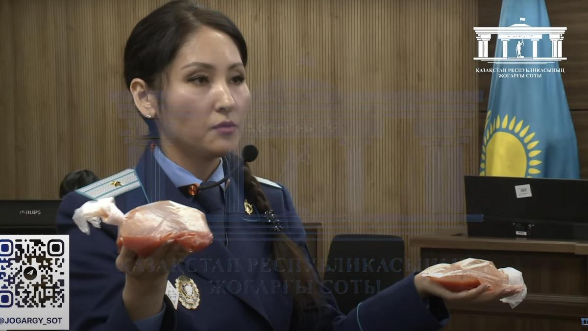 Прокурор Айжан Аймаганова сначала показала бутылек с "кровью" в объеме 70 мл. Она отметила, что столько крови в мозгу, как ранее подтверждал эксперт – это смертельно.