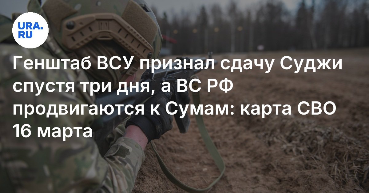 Генеральный штаб ВСУ опубликовал карту, на которой видно, что украинские войска покидают Суджу в Курской области. За 16 марта зафиксировано 19 боевых столкновений. Российские войска провели 34 авиационных налета, сбросив 63 управляемые авиабомбы, а также выполнили 243 артиллерийских обстрела, включая пять залпов из реактивных систем залпового огня.