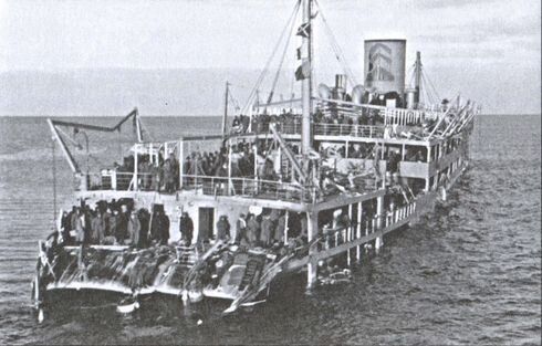 Турбоэлектроход "Иосиф Сталин", подорвавшийся на мине. Снимок с немецкого или финского катера