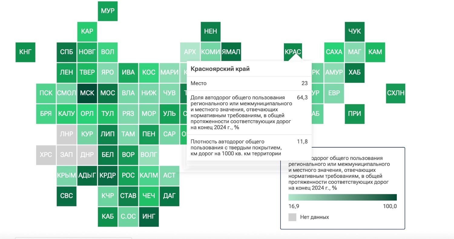 В Красноярском крае 45,2% дорог не отвечают нормативам — с таким результатом край занял 23-е место. В 2023 году у края было 20-е место в топе, а в 2022 году 16-е.
