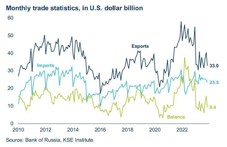 У России все хорошо с экспортом и импортом - ежемесячный профицит более $10 млрд. Сравнение с предущим годом некорректно из-за аномальных цен. Сейчас же ситуация скорее напоминает 2017-2019 год – время «стабильности», пишет немецкий KSE Institute. Кризисом же можно считать экспортную выручку $18-20 млрд в месяц – как в 2015 году. Это почти вдвое меньше текущей. @banksta