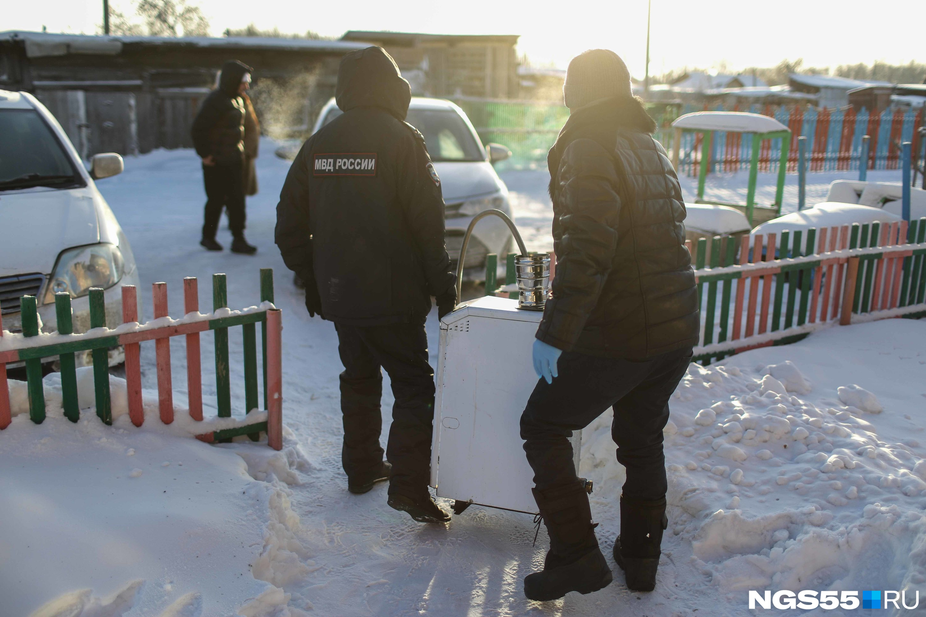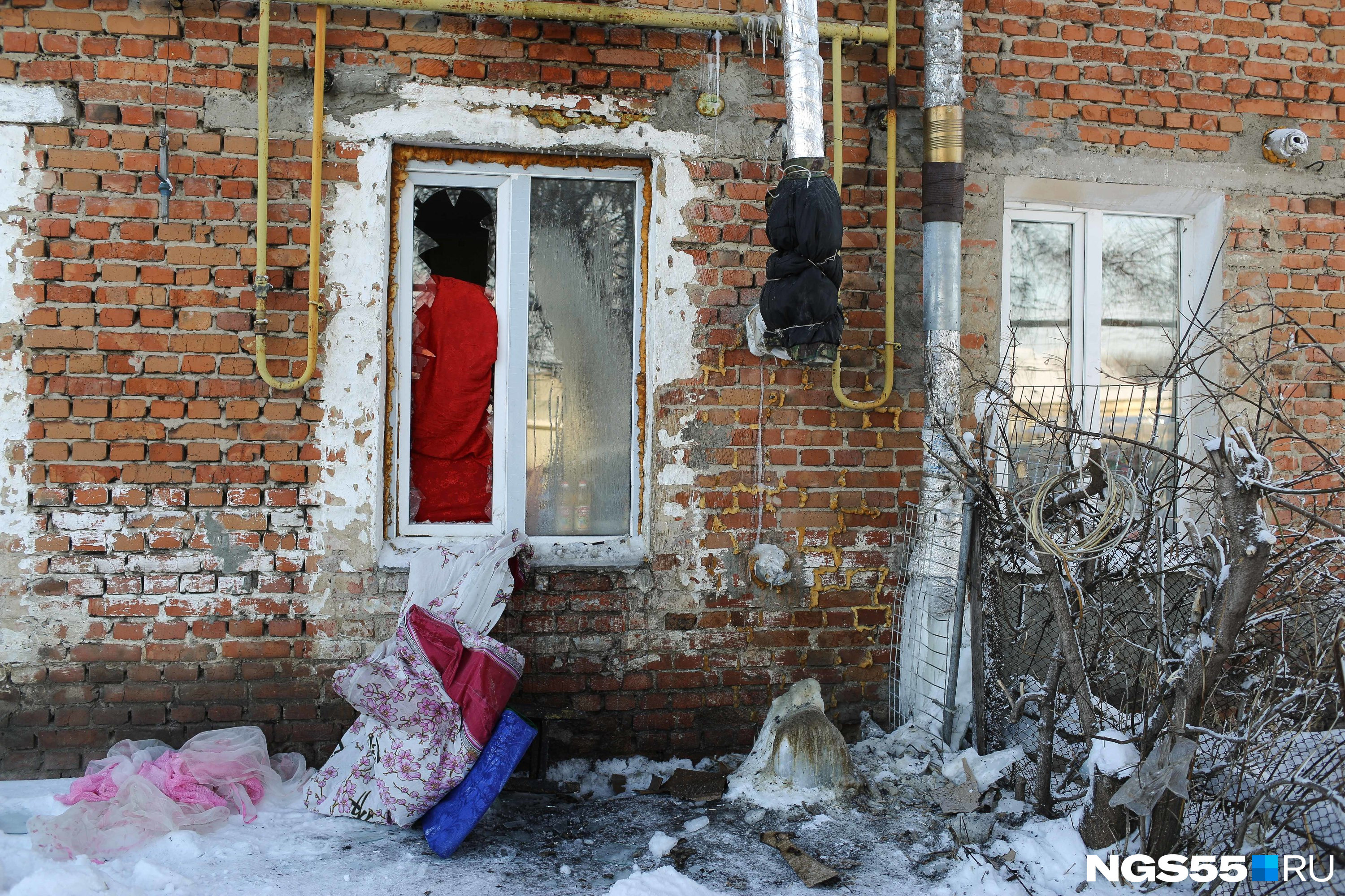 Возле двухэтажного дома на улице Зеленой многолюдно. Рядом стоит полицейская «буханка», сотрудники держатся возле подъезда. Здесь несколько часов работают следователи СК, а сотрудники «Омскоблгаза» проверяют газовое оборудование. Во дворе натоптано. Громко лает собака. Одно из окон первого этажа разбито и сейчас завешено различными тряпками — одеялами и покрывалами. Из кирпичной стены дома выходит дымоходная труба. Местные говорят, что именно она стала причиной трагедии.