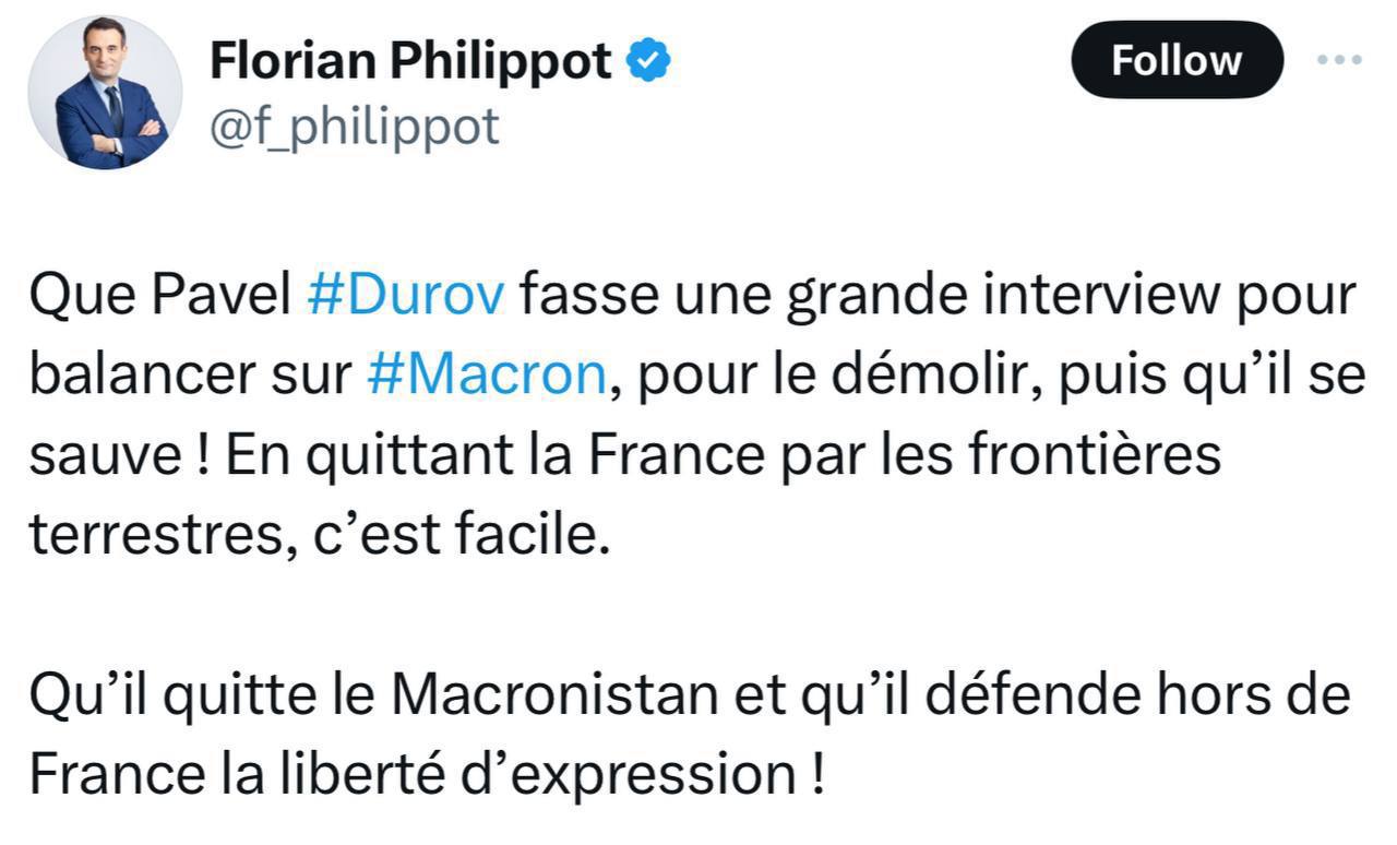 Лидер французской партии «Патриоты» Флориан Филиппо: «Пусть Павел Дуров даст большое интервью, чтобы разгромить Макрона, уничтожить его, а потом пусть убежит! Покинуть Францию через сухопутную границу легко. Пусть он покинет Макронистан и защитит свободу слова за пределами Франции!»