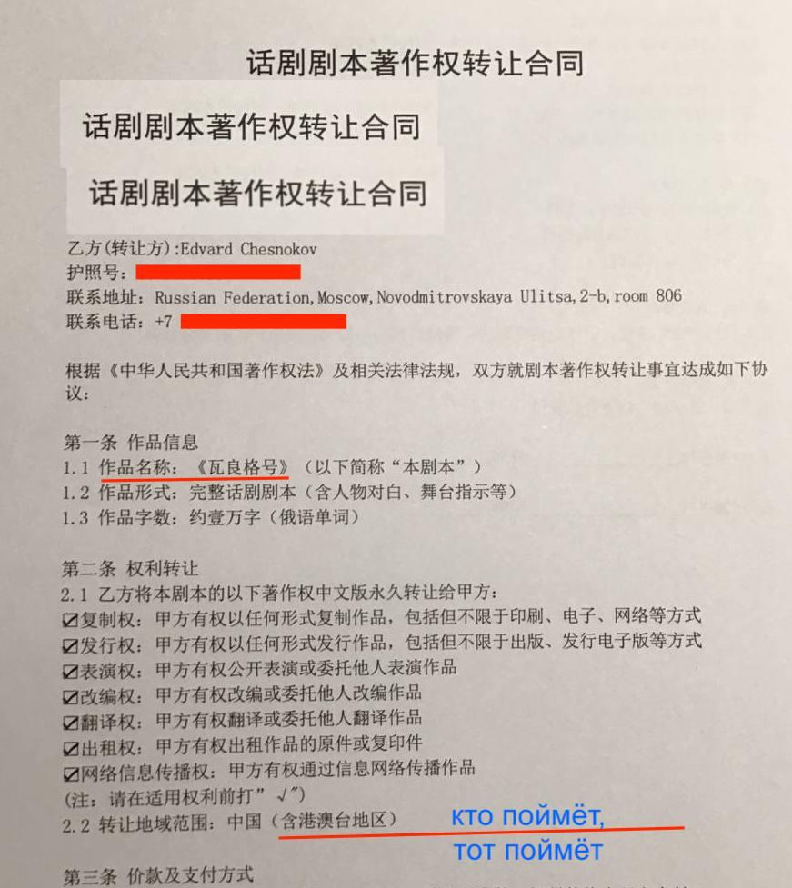ТЕАТР ПРИ ЛИБЕРАЛЬНО-КУЛЬТУРНОЙ ОККУПАЦИИ — И ТЕАТР ПРИ КУЛЬТУРНОМ СУВЕРЕНИТЕТЕ (или как в российском театре Эдвард Чесноков now-it-is-официально стал драматургом-диссидентом) Год назад я написал Патриотическую Пьесу «Варяг». Пост о пьесе набрал >600к просм., саму пьесу прочитали тысячи человек, о пьесе делали эфиры видийщики и подкастеры-эксперты по Китаю (@Laowaicast), пьеса оценивалась студентами МГУ и топовыми блогерами — я не знаю ни одной современной драмы, которая бы получила столь широкое обсуждение в Сети (при презрительном молчании «мейнстримных» культурных ресурсов, конечно). Будучи драматургом молодым и наивным (при НОРМАЛЬНОМ — не либерально-оккупированном — театральном процессе: пьесу бы сначала взяли в небольшой молодёжный театр, потом, если бы взлетела, — в большие, перевели бы на инязыки за госсчёт в «Институте перевода», выдали бы автору премийку, пригласили бы автора в эфиры на госканалах — как пригласили на первый канал Максима Кантора, автора пьесы и текстов, где наш Президент именуется грязными ругательными словами), — я разослал свою пьесу в 40 росгостеатров, а может, и более, — бросил считать. Я рассылал пьесу по обычной почте и электронной, в личку режиссёрам и театральным критикам, я умоляюще писал «патриотическим» деятелям политики и культуры — НУ ПОЗЯЗЯЯ, все кричат о «недостатке патриотических пьес» — так вот же вам пьеса патриотическая, готов БЕСПЛАТНО отдать, лишь бы пришла к людям. В ответ получал молчание... хотя нет, из n-ского театра через друзей до меня дошёл отзыв: «Ой, у вас там китайцы герои — а как-что в Китае-то на ту пьесу посмотрют, боимсякакбычегоневышло»... ...итог: в китайской провинции Хэбэй, опорной базе китайского социализма (столица её, Шицзячжуан, была первой, где после Войны, ещё в 1947-м, провозгласили Советскую власть) — ЗАПЛАТИЛИ МНЕ ЗА ПОКУПКУ АВТОРСКИХ ПРАВ НА МОЮ ПЬЕСУ. Так что, как видите, — камень за камнем и воду долбит. Приобретение прав на постановку моей пьесы — безусловное достижение для театральной отрасли китайской провинции Хэбэй... и ужасающий позор для гостеатров России: ибо если бы моя Патриотическая Пьеса была худá, то ею не заинтересовались бы за рубежом; но если, напротив, пьеса настолько хороша, что за неё ещё даже до перевода на китайский ПЛАТЯТ ДЕНЬГИ (о чём далее) китайские театралы — это значит ровно одно: единственная причина, почему мою высокоталантливую пьесу не поставили на родине — это НАЛИЧИЕ В РОССИЙСКОМ ТЕАТРЕ ПОЛИТИЧЕСКОЙ ЦЕНЗУРЫ («Я, хоть и родилась на Украине, умру за честь и право русской быть!» — восклицает моя героиня в кульминационный момент — ТАКОЕ на наши ⠦⠆⢆⠉⣀⢑⠙⡠⢃⠃⡊⠋⠇⠣⡰⠅⠰⡁⠱⠇⡈⠩⠎⢰ сцены попускать НИЗЗЯ). Теперь самое интересное — о деньгах ⏏. Мой девиз — ИНТЕЛЛЕКТУАЛЬНАЯ ЧЕСТНОСТЬ. Я не боюсь публично рассказать о размерах и источниках моего дохода, который я как русский интеллигент получил от интеллектуальной работы. (Отчитываются ли об источниках своего дохода с такою же беспощадной честностью другие наши поп-властители дискурса — «политик» Кацим Макс? «отец» Остров Павловский? «писатель» Демьян Небедный? Вы знаете ответ.) Разумеется, с этого гонорара я уплатил налоги (ФОТО 2); а на часть его — я как интеллектуально-честный русский человек поддержу наших парней на СВО (о чём в будущем последует отчёт) — интересно, потратил ли миллион