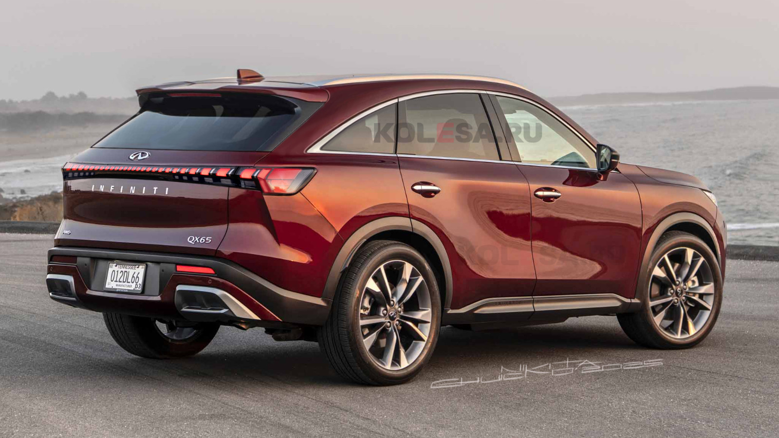 Конечно, уже по пропорциям видно, что полноценной заменой того кроссовера QX65 не станет из-за пропорций: длинный передний свес и исчезающе малое расстояние между передней колёсной аркой и дверью достанутся новинке от родственного QX60, сделанного на переднеприводной платформе. При этом передняя часть будет полностью новой, выполненной в стилистике нового флагмана QX80. Здесь появится «двухэтажная» передняя оптика с аналогичными ходовыми огнями в виде выстроенных в ряд четырёхугольников, в то время как основные блоки фар расположены чуть ниже в бампере. Отличительной особенностью QX65 станет более покатая в задней части крыша и характерная форма бокового остекления, вызывающая ассоциации с теми самыми FX и QX70 . Корма получит оригинальные фонари несколько иной формы и со своим рисунком светодиодных огней.