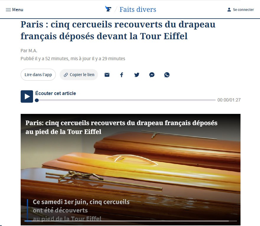 Как пишет газета Le Figaro, активисты установили возле главной достопримечательности Парижа пять пустых гробов. А рядом плакат с надписью: «Французские солдаты, погибшие на Украине».