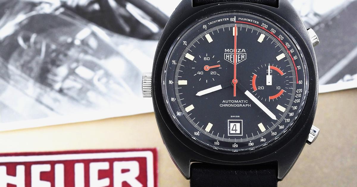 Les deux autres lots les plus intéressants pour les fans de Heuer et TAG Heuer remontent aux années 1970. Coup de cœur absolu pour un chronographe Heuer Monza Automatic Black PVD réf. 150.501), vers 1977, dans un état flamboyant (Est. 3500-4500 €). On adore son boîtier de forme tonneau (39 x 44 mm) en acier anodisé noir PVD avec lunette lisse (coup à 11 h), poussoirs et dos vissé en acier (signé Leonidas Heuer intérieur, Monza Heuer et numéroté). Son cadran noir possède 2 compteurs cerclés (petite seconde décalée à 10 h, minutes à 3h avec marquage 5 m rouge et guichet de date à 6h), avec échelle tachymétrique sur le rehaut et trotteuse rouge du chrono au centre. Un must have pour les collectionneurs, au calibre automatique signé HEUER / Buren 15 Swiss.