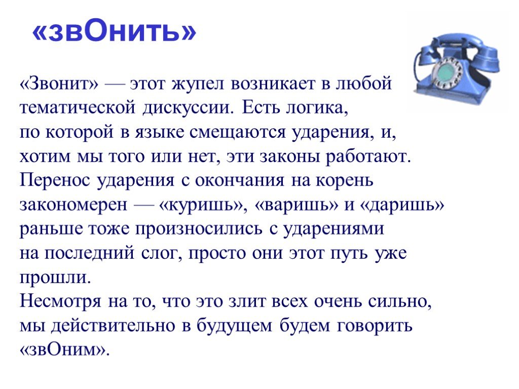 Мария Каленчук, главный научный сотрудник Института русского языка, успокаивает: ««Что тогда делать со словами «варит», «солит», «дружит» и тысячами аналогичных. В этих словах ударение меняется по определенной модели, просто в слове «звонит» изменение началось позже, чем в остальных, а если оно началось, то оно, скорее всего, закончится».