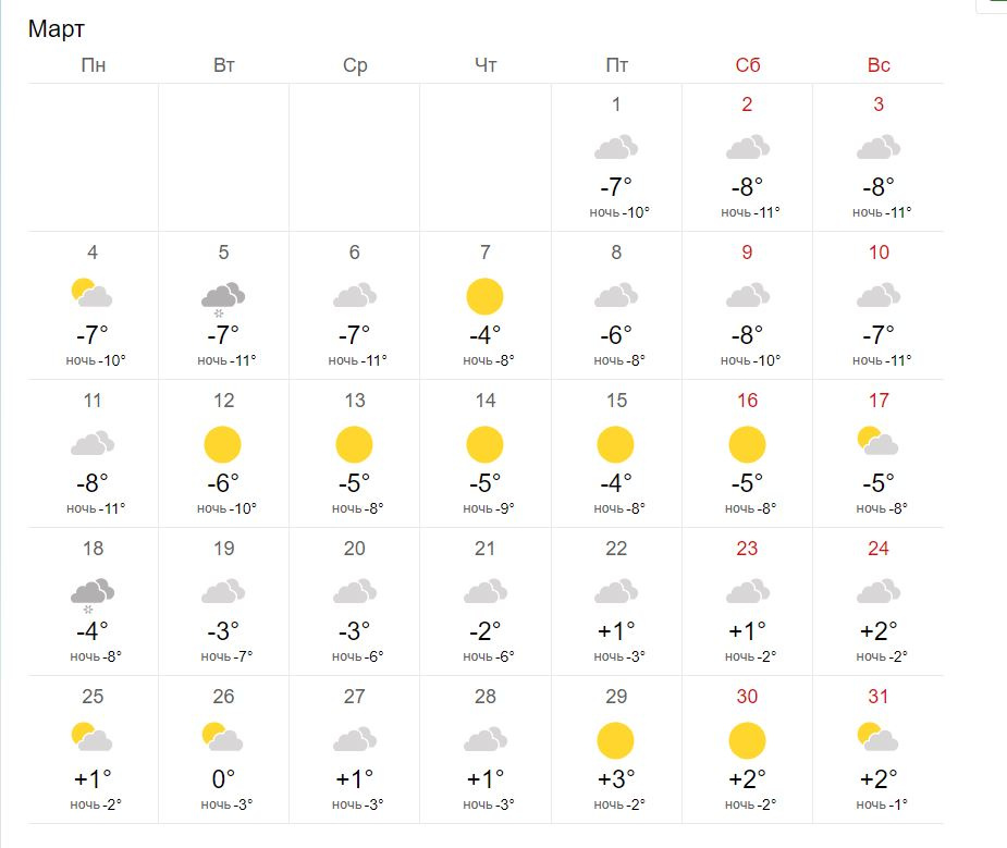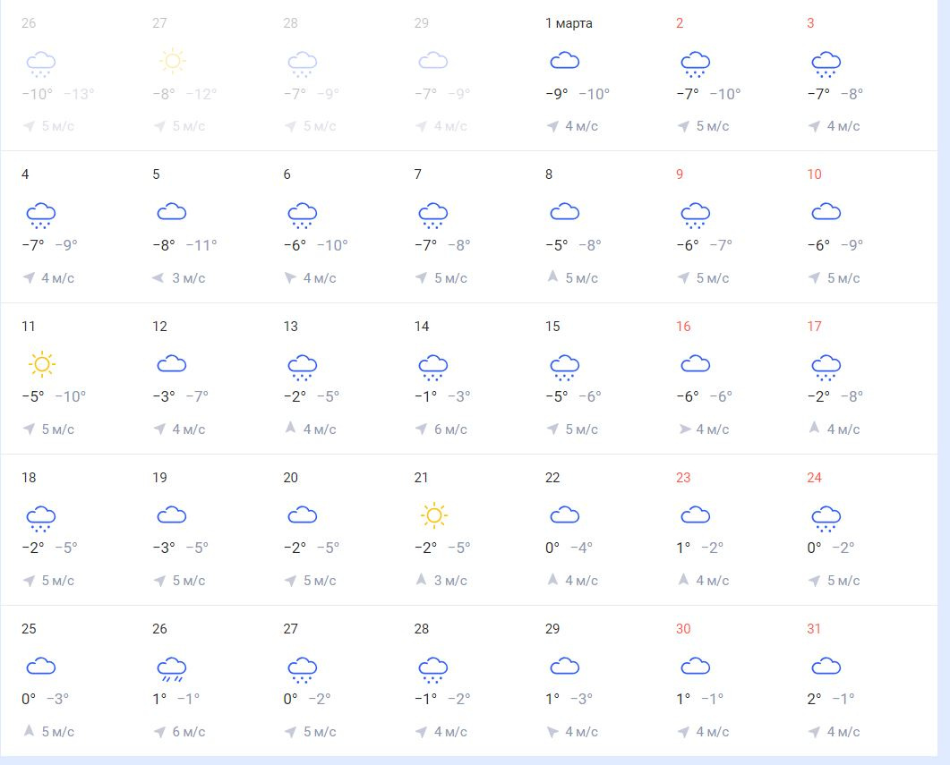Самый холодный день, судя по прогнозу, будет 2 марта, когда ночью столбик термометра покажет -15 градусов, а днем — -8. Теплее всего сервис прогнозирует 25, 26 и 29 марта. В эти дни ночная температура ожидается -5 градусов, а дневная — +1.