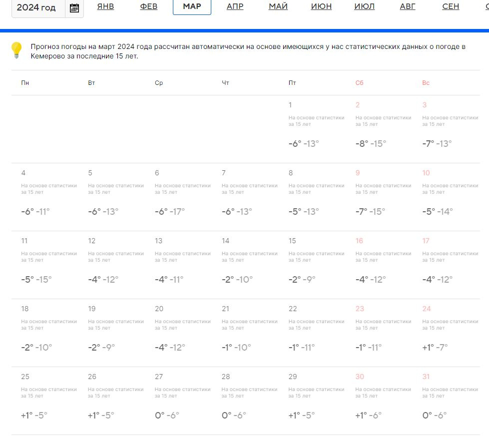 Ранее синоптики Гидрометцентра России сообщали предварительный прогноз на полгода — с сентября 2023 по март 2024 года. Судя по нему, в Кузбассе будет привычная погода со среднемесячной температурой -6,4 градуса.