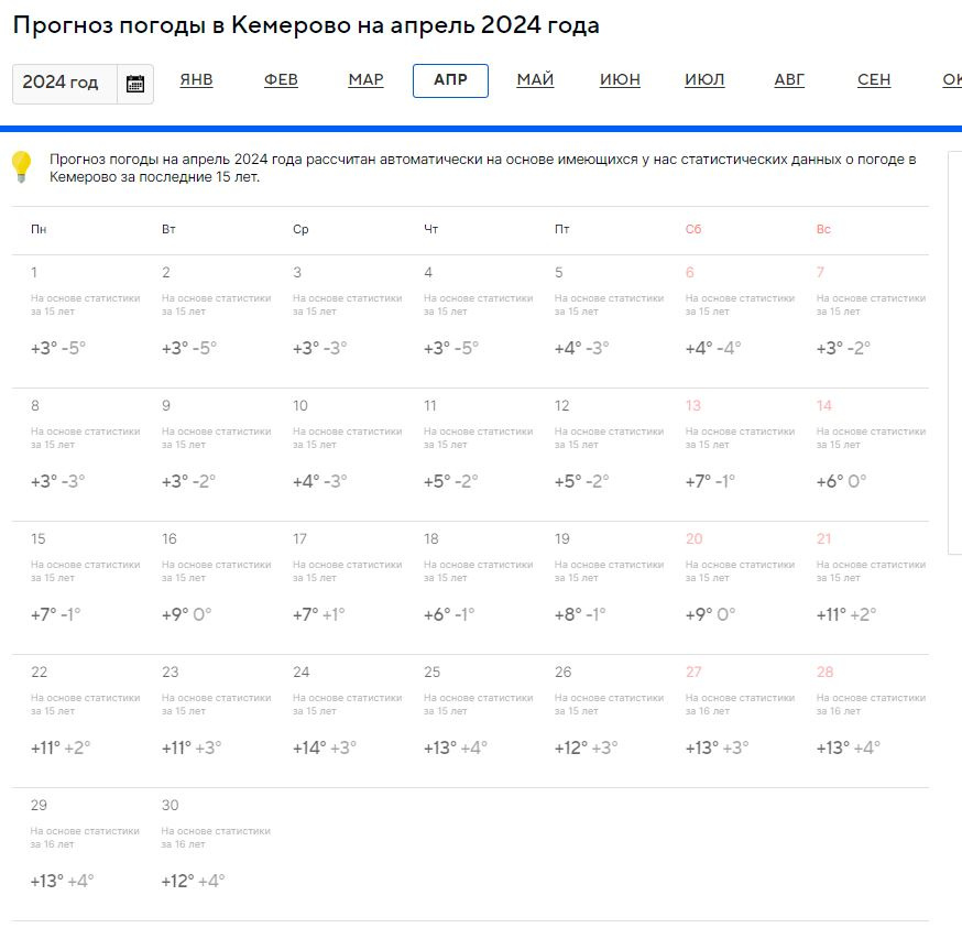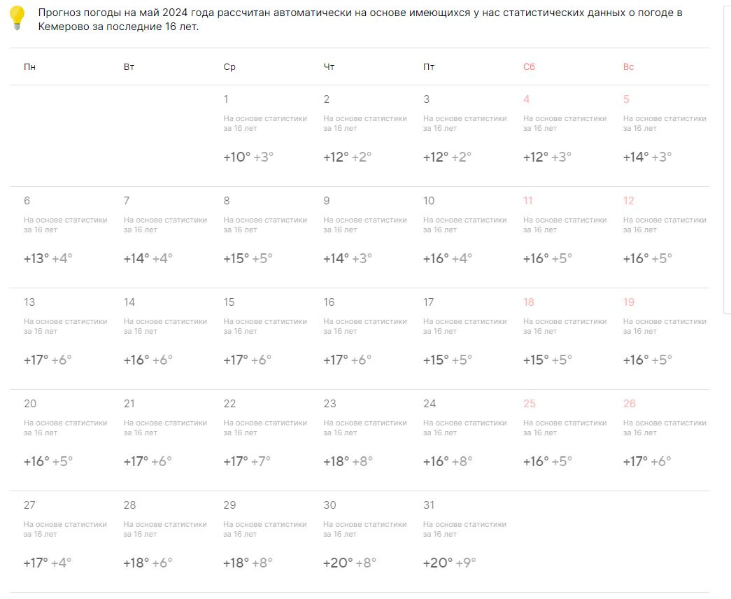 «Рамблер.Погода» обещает кемеровчанам шесть ясных дней и 13 дней дождей — остальное время будет облачно. Майские праздники не порадуют, судя по данным, сильным теплом.