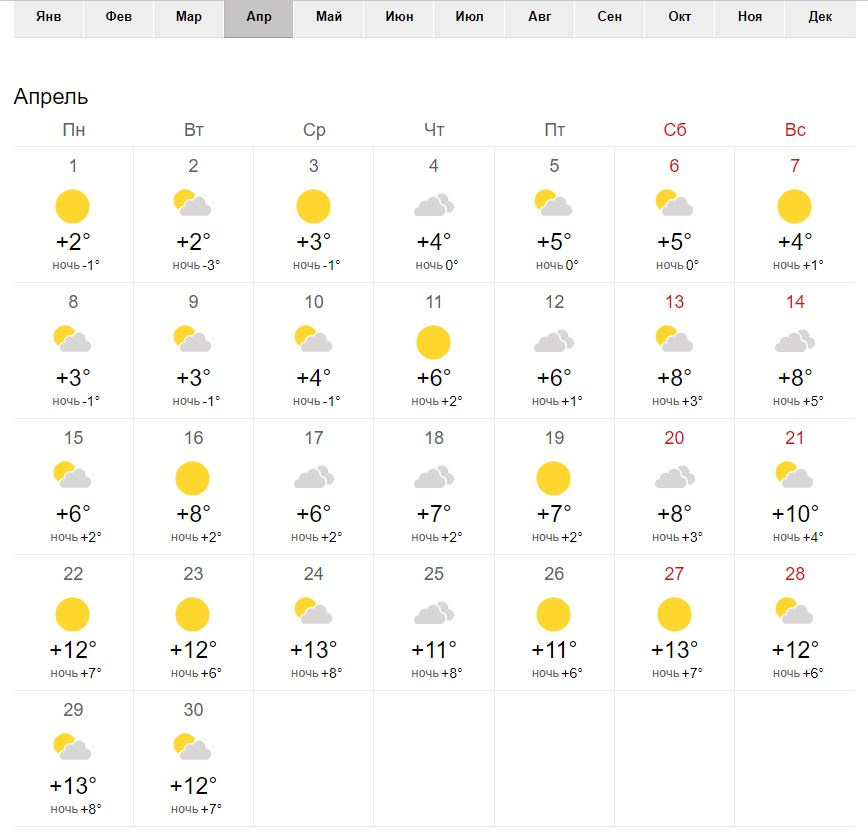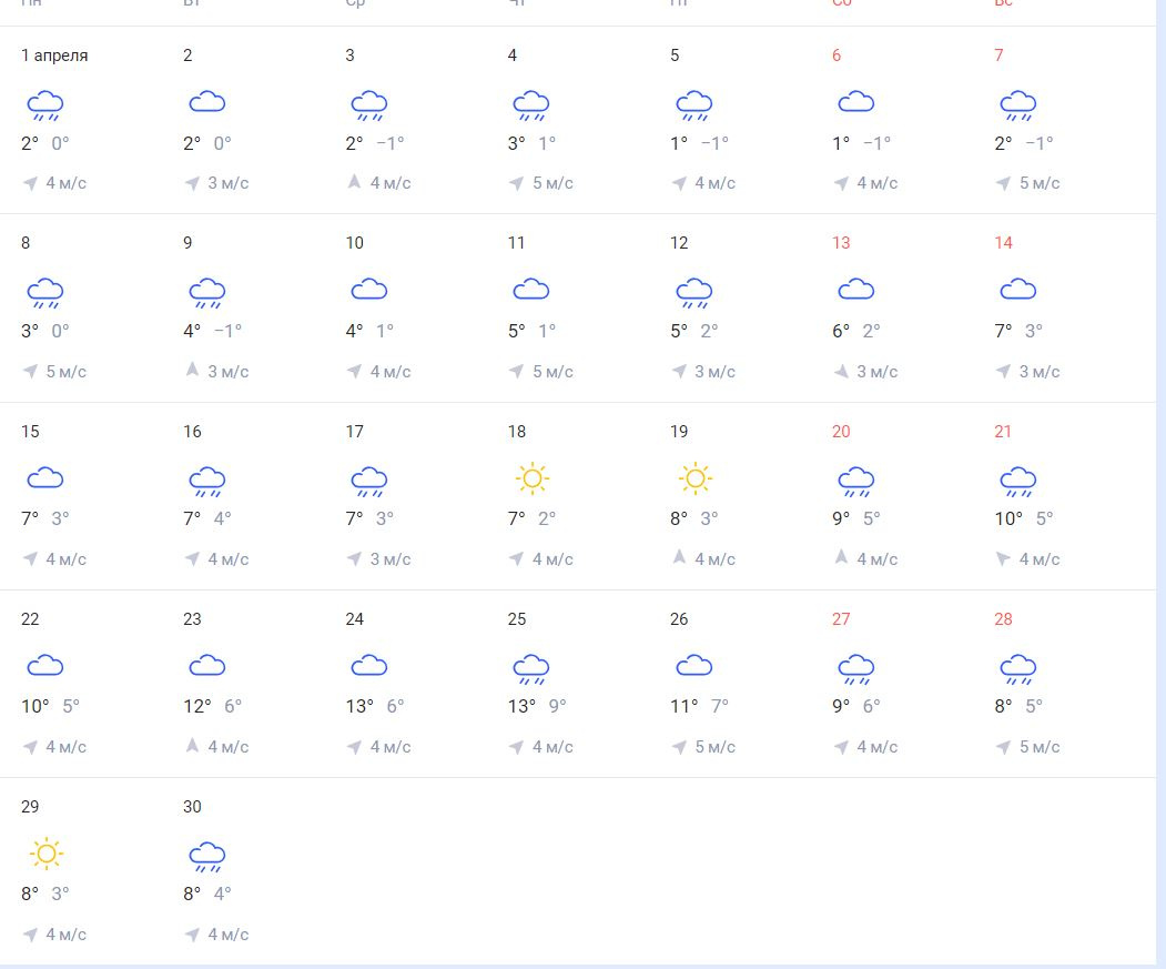 Самый же теплый день будет 25 апреля — сервис обещает +13 градусов днем и +9 ночью.