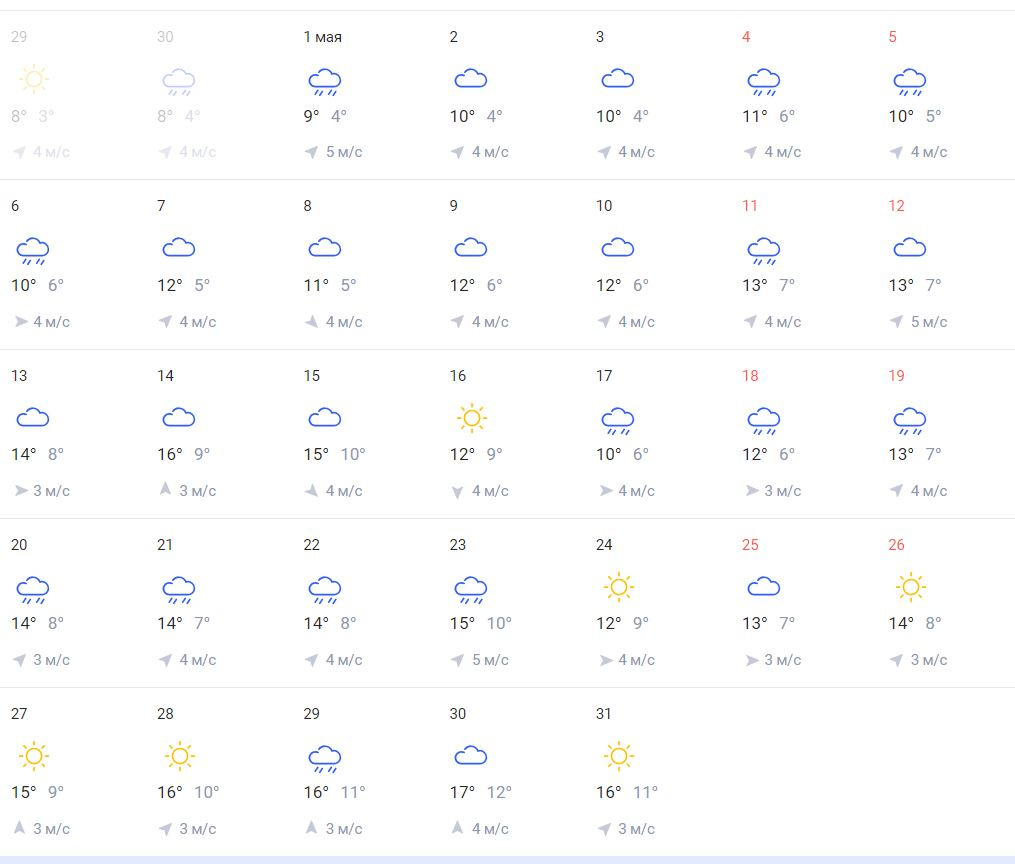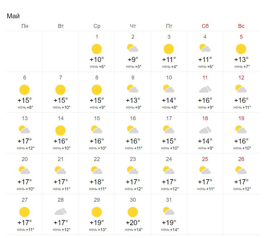 Холоднее всего будет 2 мая, когда столбик термометра покажет +9 градусов днем и +5 градусов ночью. Самым теплым днем станет 30 мая: сервис сообщает, что в этот день днем будет +20 градусов, а ночью похолодает до +14.