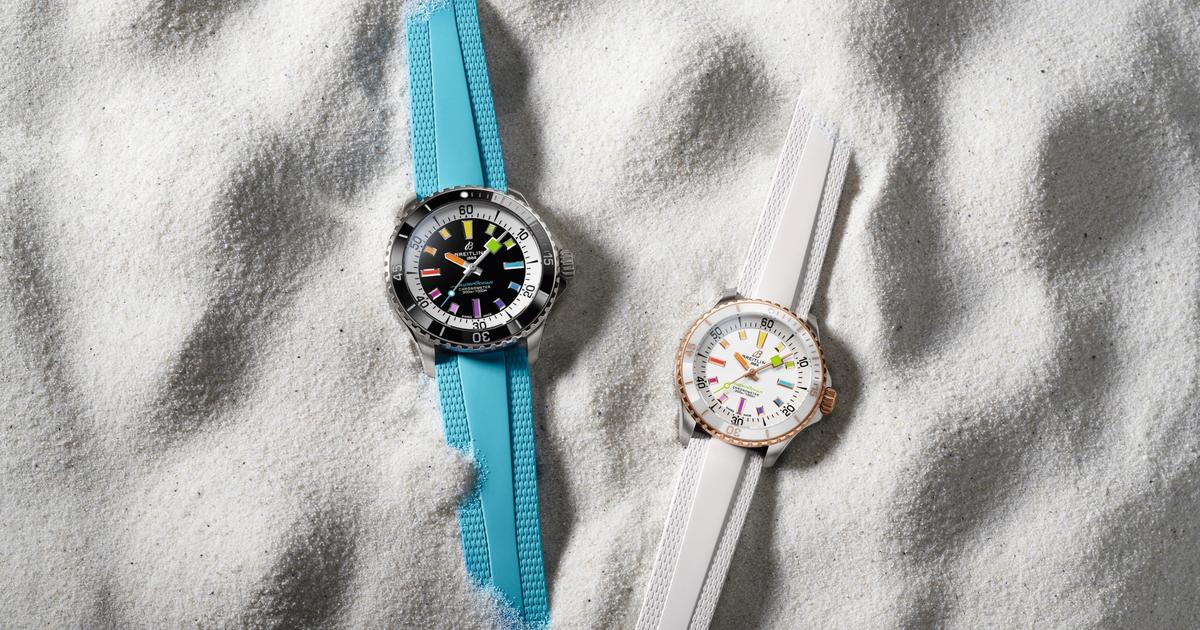« Avec l’été qui approche, nos nouveaux modèles Superocean colorés sont vos compagnons idéals pour surfer sur les vagues ou se détendre lors d’un dîner sur la plage », explique Georges Kern, PDG de Breitling. Des montres qui s’inspirent de la légendaire SuperOcean Slow Motion des années 1960 et 1970, qui a simplifié la montre de plongée en ne conservant que les éléments essentiels. Parmi eux, une échelle des minutes contrastante et audacieuse sur l’anneau du cadran ainsi que des index larges luminescents et des aiguilles « pagaies » apportent une meilleure lisibilité sous l’eau. Ici, l’aiguille des secondes est remplacée par un chronographe innovant basé sur les minutes mettant une heure pour effectuer une rotation complète. La Superocean d’aujourd’hui conserve cet aspect pratique tout en réintégrant l’aiguille des secondes et en ajoutant des fonctions modernes.