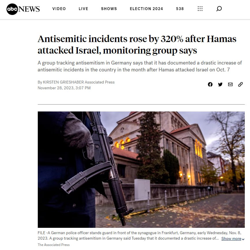 ABC News: Антисемитские инциденты выросли на 320% после нападения ХАМАС на Израиль